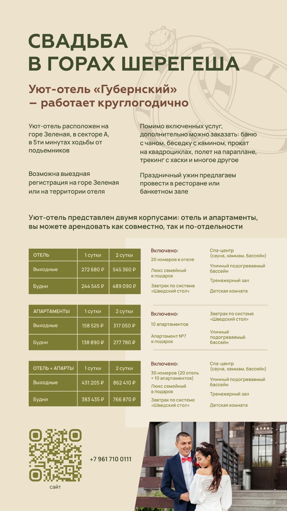 Мы предлагаем идеальное решение на ваш запрос - где провести свадьбу. Отель "Губернский" Шерегеш, ул. Снежная, 27.
